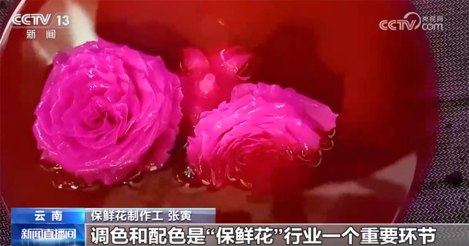 “保鲜花”制作工张寅称:“调色和配色是‘保鲜花’行业的一个重要环节,会影响‘保鲜花’的价值,为了达到丰富的色彩效果,我们必须精确控制每一个关键因素。”