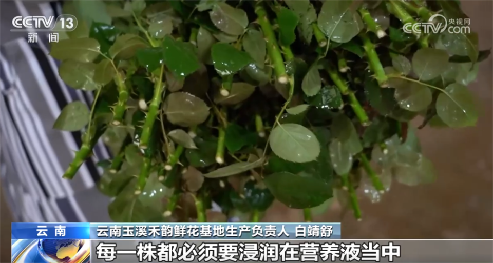 记者探访了玉溪一家鲜花生产企业,刚刚采摘下来的花儿当地人叫作“毛花”,在这个预冷库里边要进行分选等级,记者注意到这些排队进行分选的鲜花没有脱离“在鲜”的状态,安置在这些插花筒里面,来保持它的新鲜度。据介绍,诀窍是在这些插花筒里面放一定高度的营养液。从鲜花剪下来,每一株都必须浸润在营养液当中,营养液的主要成分一个是糖分,还有一个是杀菌剂。